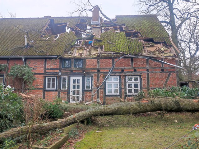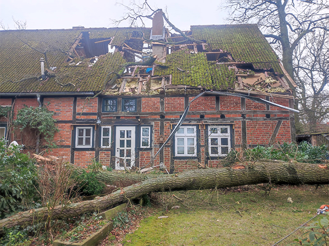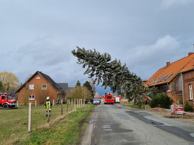 Großer Sachschaden entstand an einem Fachwerkhaus in Nienwalde (SG Gartow). Dort stürzte gegen 8:00 Uhr eine Eiche auf das Dach des Wohnhauses und richtete erheblichen Schaden an.