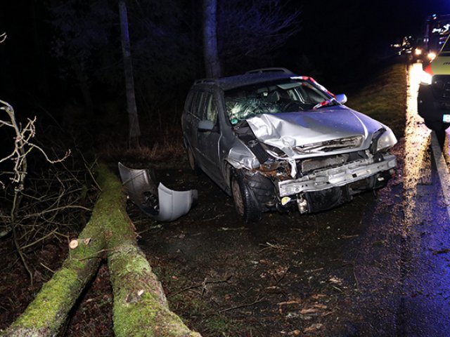 Zahlreiche Bäume knicken ab und stürzen um ++ Wohnhäuser z.T. stark beschädigt ++ gesperrte und blockierte Straßen im ganzen Landkreis ++ zwei Verkehrsunfälle am frühen Morgen