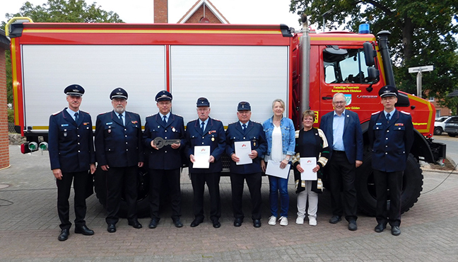 Neben der Fahrzeugübergabe standen bei der Feierstunde auch zahlreiche Jubiläen im Mittelpunkt: Die Jugendfeuerwehr Gülden besteht seit 60 Jahren, der Förderverein kann auf 25 Jahre Bestehen zurückblicken. Auch Ehrungen wurden ausgesprochen: Angela Boge-Behr und Kathrin Köppen erhielten Auszeichnungen für 25 Jahre fördernde Mitgliedschaft, während Uwe Beutler und Werner Köppen für beeindruckende 60 Jahre Mitgliedschaft in der Feuerwehr geehrt wurden.