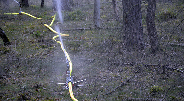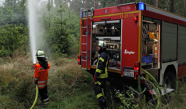 Bei der Riegelstellung kamen u.a. die neu beschafften Kreisregner der Feuerwehr Wustrow zum Einsatz. Optisch erinnern die Geräte an Rasensprenger, auf einer Strecke von ca. 200m geben diese konstant Wasser in den Wald und leisten so einen wertvollen Beitrag zum Einsatzerfolg ohne viel Personal zu binden. In Kombination mit dem Schlauchwagen (SW2000) und dem großen Wasserfass der Feuerwehr Kiefen (bis zu 19.000 Liter Wasser) konnte das Feuer in seiner Ausbreitung gestoppt werden.