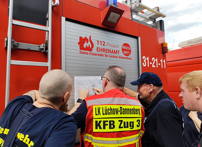 Als diese Maßnahmen erste Erfolge zeigten, meldete die FF Plate „Wasserentnahmestelle versiegt“ – der Unterflurhydrant lieferte aus unbekannten Gründen kein Wasser mehr. Unverzüglich wurde im Einsatzleitwagen auf dem vorhandenen Kartenmaterial nach einem anderen, geeigneten Unterflurhydranten gesucht und die FF Plate entsprechend dorthin geleitet. Parallel meldet sich ein Landwirt bei der Einsatzleitung und bot sein, seine Ringleitung der Feldberegnung für die Wasserentnahme zur Brandbekämpfung zu nutzen.