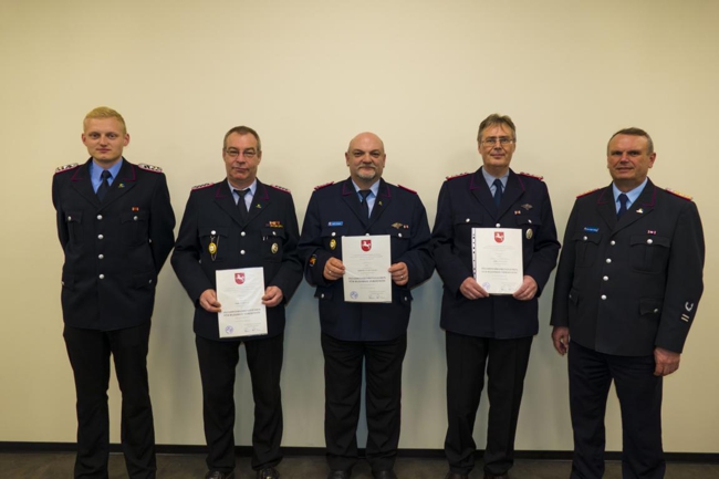 Kreisbrandmeister Claus Bauck ehrte Jörg Pengel, Dirk Schulz und Martin Schlegel für ihre 40-jährige aktive Mitgliedschaft.