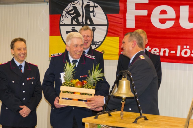 Zum Ende der Versammlung wurde noch mal ein riesen Dank ausgesprochen. Horst Lichtenberg hat viele Jahre auch nach seiner Feuerwehrrente die Feuerwehr besonders unterstützt. Er hat als Hausmeister dafür gesorgt, dass das alte Feuerwehrhaus immer sauber und ordentlich ist. Außerdem hat er oft bei Einsätzen, die länger dauerten unter anderem Kaffee zur Stärkung der Kameraden gekocht. Auch wenn diese Einsätze mitten in der Nacht waren, war er immer für die Einsatzkräfte da. Horst-Jürgen Schlegel überreichte ihm ein großes Geschenk und die Kameraden ehrten es ihm mit einem sehr langen Applaus.