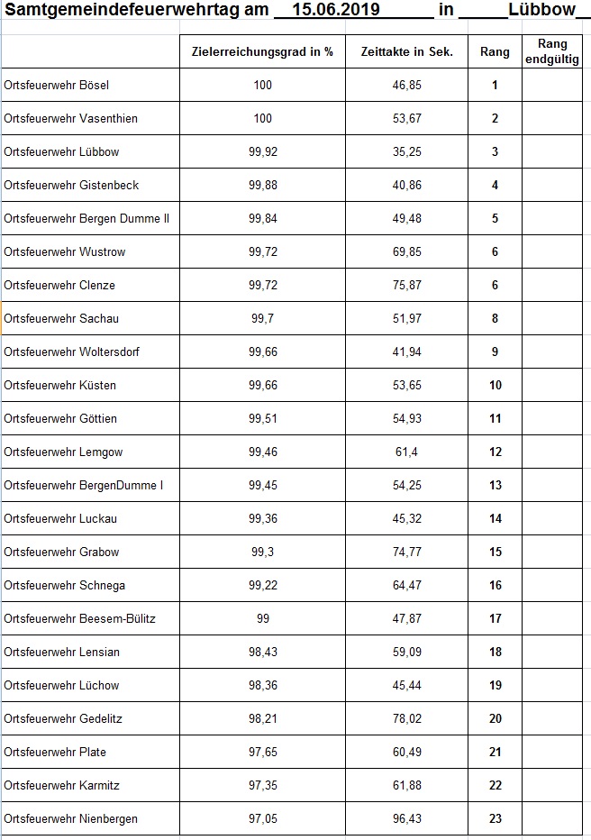Ergebnisse sind ein Indiz dafür, welche Qualitätsansprüche in der Ausbildung unsere Feuerwehrleute erfüllt werden. Die Kameradinnen und Kameraden in der Samtgemeinde stellen eine schlagfertige Feuerwehr. " Die Wettkampfgruppe aus Bösel hatte gerade einmal 0,34% Vorsprung vor den Zehntplatzierten aus Küsten.