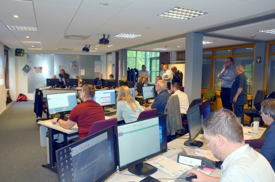 Im Kreishaus ist jetzt ein kompletter Gebäudeteil gesperrt – „STOP – Zutritt nur für Mitarbeiter des Katastrophenschutz-Stabes“ steht auf großen Schildern. Hintern den Türen herrscht indes reges Treiben: etwa 20 PC Arbeitsplätze finden sich in dem großen Stabsraum, 2 Projektoren werfen Lagekarte und aktuelle Meldungen für alle sichtbar an die Wand – sodass jeder Stabsmitarbeiter sich schnell einen Überblick verschaffen kann.