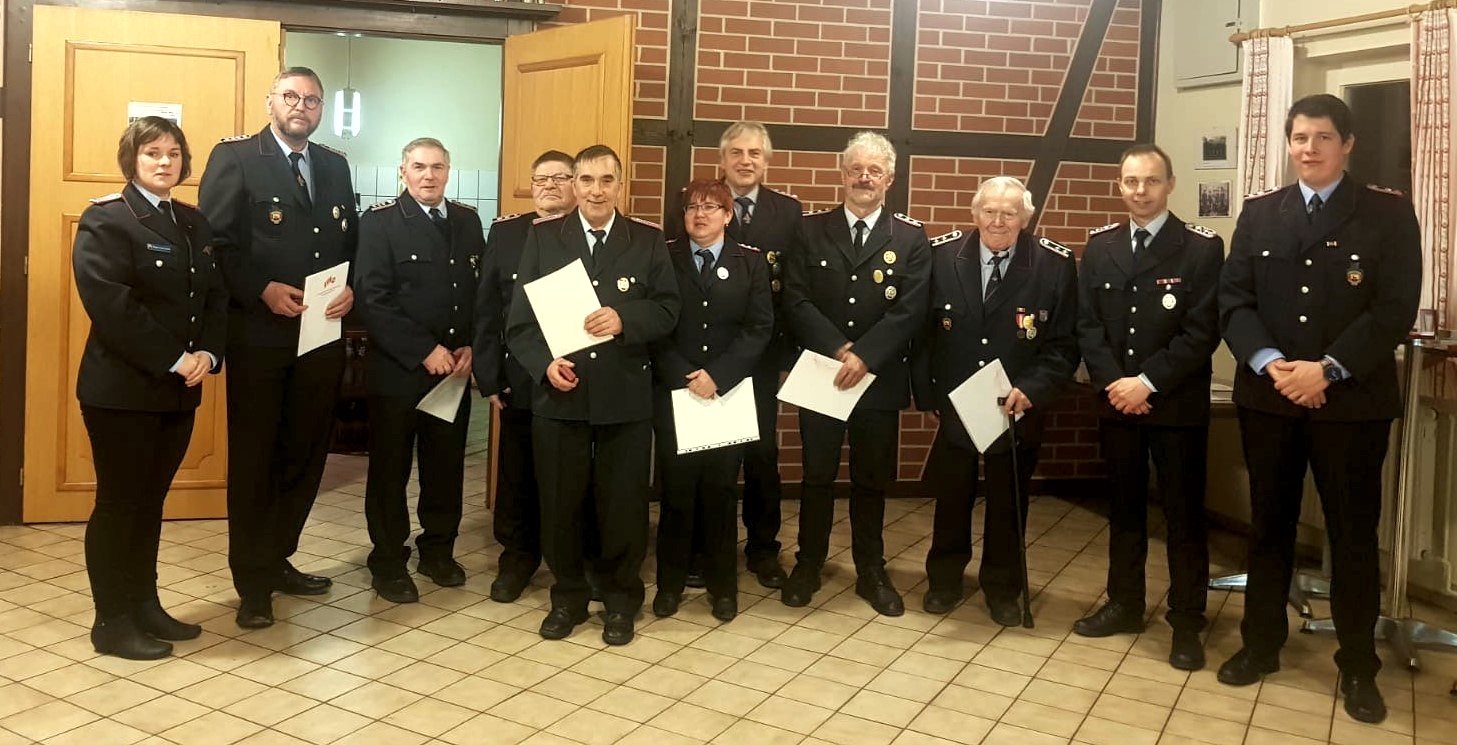 Nach den Wahlen beförderte Reiner Berndt Nick Berndt zum Feuerwehrmannanwärter, Jörn Volkmann und Patrick Wolff zu Feuerwehrmännern, sowie Horst Brüggen zum Ersten Hauptfeuerwehrmann. Außerdem überreichte Tatjana Korf-Jahrens (Geschäftsführerin des Kreisfeuerwehrvorstandes) Auszeichnungen für 25-Jährige Mitgliedschaft an Annette Brüggen. 40 Jahre an Eckhard Rüdiger, Bernd Meyer und Hartmut Meyer. Für 50 Jahre an Manfred Krüger, Herbert Jagotke, und Hans-Adolf Dreyer. Sowie 60 Jahre an Willi Hahlbohm.