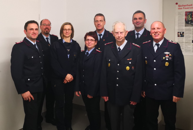 Foto (Von links) Bastian Kaufmann, Ortsbrandmeister Ralf Peter Knist, Tanja Webs, Carola Roost, Gemeindebrandmeister Torsten Bresse, Ernst Tribijahn, Markus Kaufmann, Friedrich Gielnik