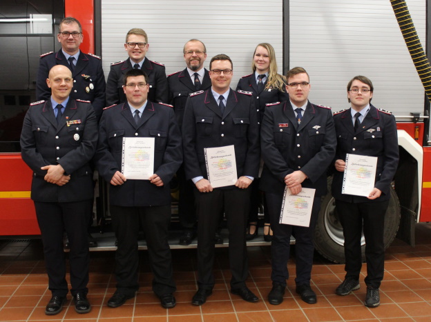 Beförderungen: Thorben Trumann und Moritz Machel zum Oberfeuerwehrmann Sören Ponath, Leif Morten Erichsen und Sebastian Jessen zum Hauptfeuerwehrmann Thorsten Albrecht zum 1. Hauptfeuerwehrmann Maybrit Erichsen zur Oberlöschmeisterin