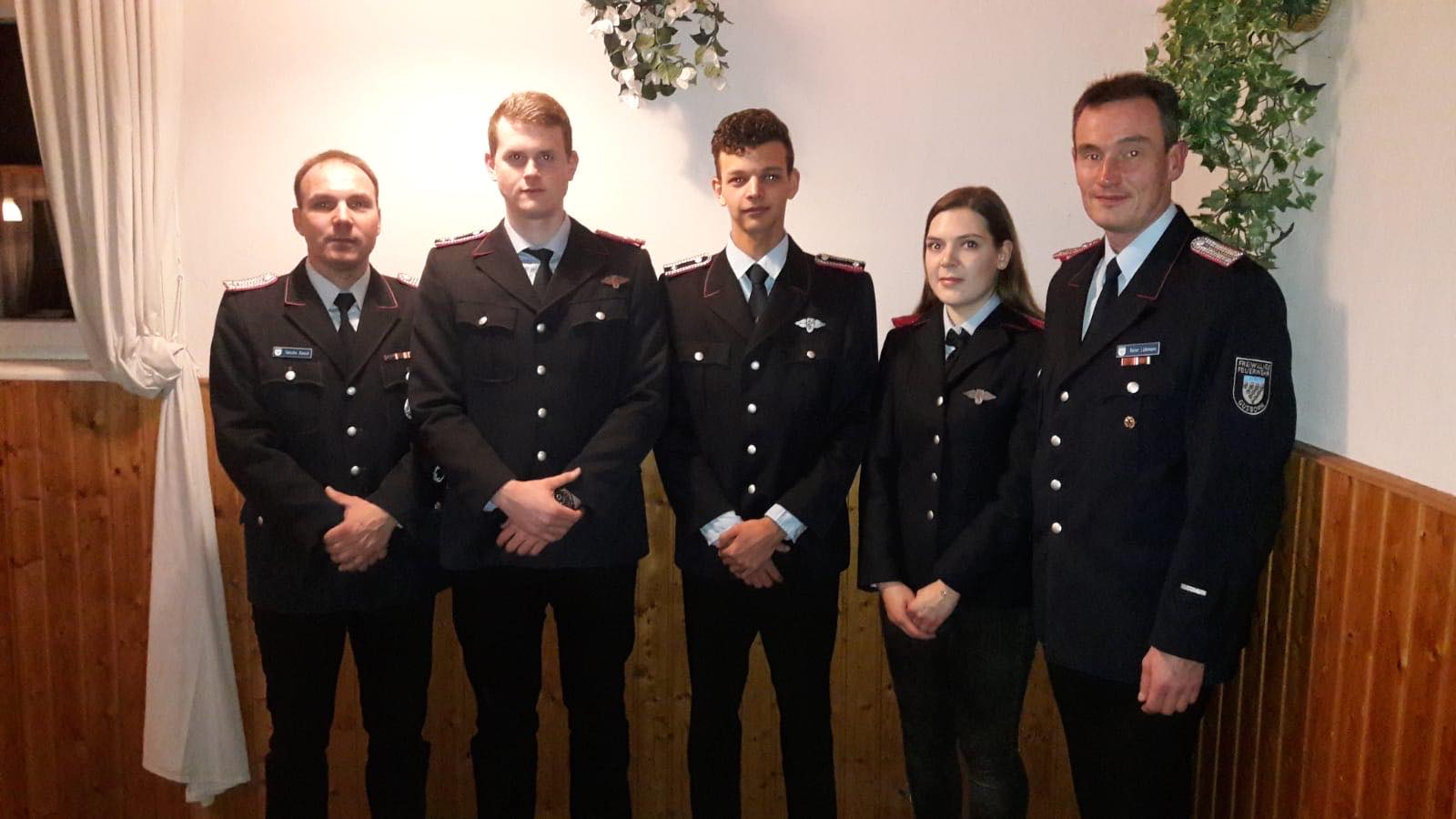 Christopher Schneider zum Oberfeuerwehrmann befördert und Hauptfeuerwehrmann/ -frau dürfen sich fortan Maximilian Becker und Vanessa Webs nennen.