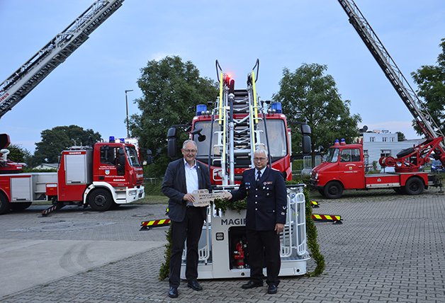 Foto(hbi): Die Schlüsselübergabe vor imposanter Kulisse: 60 Jahre Drehleiter-Technik in Dannenberg.