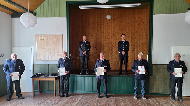 Eine der Wehren, die dieses Angebot angenommen hatte, war die Freiwillige Feuerwehr aus Holtorf. Dort gab es fünf Anlässe, die sich zu 250 Jahre Ehrenamt aufaddierten: Die drei aktiven Mitglieder Ewald Mewes, Achim Wolf und Rudi Peaslack wurden ebenso für 50jährige Mitgliedschaft geehrt, wie Gerhard Dieckmann und Malte Köpke aus der Altersabteilung der Holtorfer Wehr.