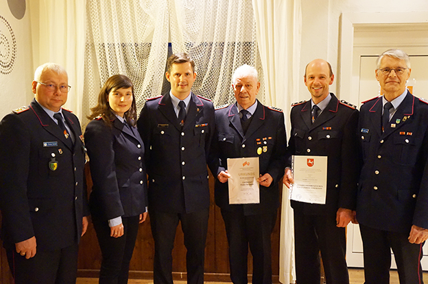 Bild v.l.n.r.: Stellvertretender Bereichsbrandmeister Thomas Schmidt, designierte Wehrleitung: Sarah Frahm und Marko Köster, geehrt für ihre 60- sowie 25-jährige Mitgliedschaft: Walter Beckmann und Volker Tiedemann, Ortsbrandmeister Siegmund Schmaggel