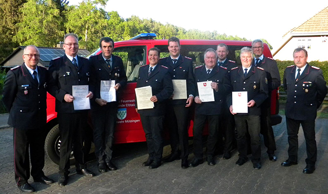 Vor vier Wochen wurden für langjährige Dienste in der Feuerwehr gleich mehrere Kamerad:innen der Ortswehr Mützingen ausgezeichnet. Aufgrund von Corona ist auch in diesem Jahr die Jahreshauptversammlung der Wehr ausgefallen. Um dennoch Ehrungen und Beförderungen auszusprechen, hatte Ortsbrandmeister Mario Kusack eine kleinere Feierstunde organisiert. Für sein 70- jähriges Jubiläum wurde Dieter Brunkhorst ausgezeichnet - diese wird ihm nachgereicht, da er nicht teilnehmen konnte. Über eine Ehrung für 50 Jahre Mitgliedschaft ist Bernd Köpke ausgezeichnet worden, für jeweils 40 Jahre Mitgliedschaft die Kameraden Edwin Hänchen und Andreas Kirchhoff. Freuen konnte sich auch Nadin Marnitz, die die silberne Ehrennadel der Feuerwehrunfallkasse (FuK) für Ihre Dienste als langjährige Sicherheitsbeauftragte entgegen nahm.