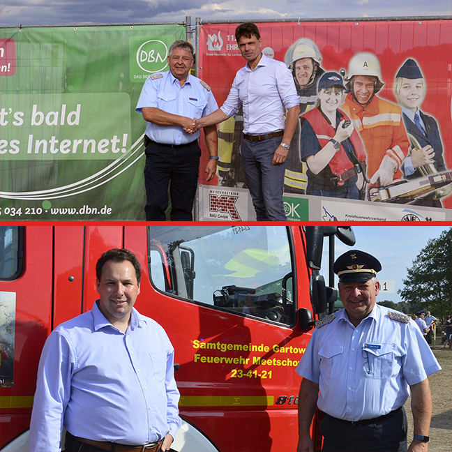 unten: Bürgermeister der Samtgemeinde Gartow Christian Järnecke und Kreisbrandmeister Claus Bauck freuen sich am Rande des Kreisfeuerwehrtags in Clenze über die getroffene Vereinbarung.