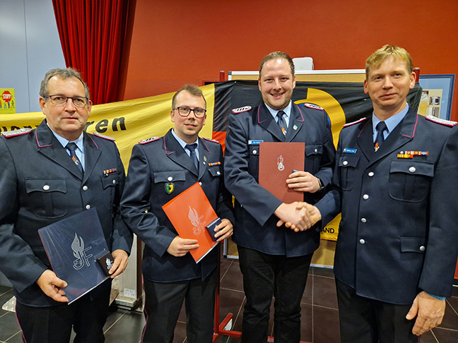 Foto (mt)von links: Stephan Viehöfer aus Jameln mit dem Ehrenzeichen der Niedersächsischen Jugendfeuerwehr ausgezeichnet, Philipp Schmidt aus Dannenberg mit der Florian-Medaille ausgezeichnet, Jens Beerbohm aus Jameln mit der Ehrennadel der Deutschen Jugendfeuerwehr in Silber ausgezeichnet, Kreisjugendfeuerwehrwart Matthias Linde gratuliert.