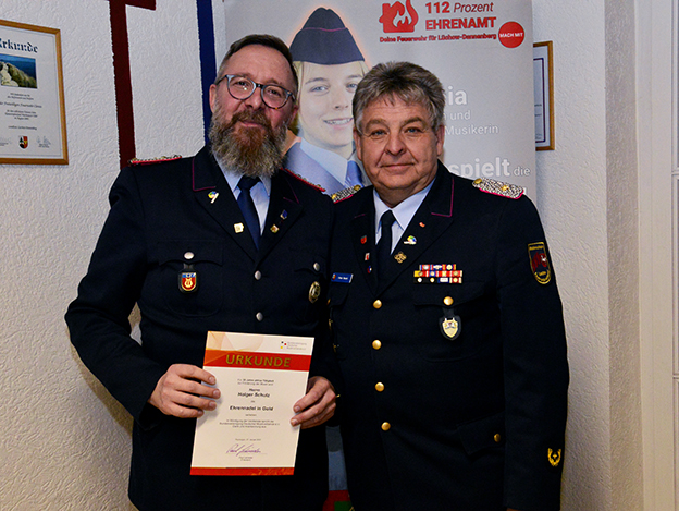 Eine Überraschung hatte der Kreisbrandmeister dann noch dabei, er nahm im Auftrag der Bundesvereinigung Deutscher Musikverbände eine nicht alltägliche Ehrung vor. Der Dirigent des Kreisfeuerwehrmusikzuges Holger Schulz wurde für 30 Jahre aktives Musikwesen mit der Ehrennadel in Gold ausgezeichnet. Bauck bekräftigte, dass Schulz einen enormen Anteil an dem Fortbestand der Feuerwehrmusik in Lüchow-Dannenberg hat.
