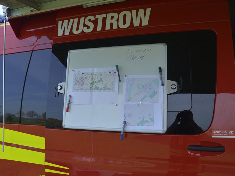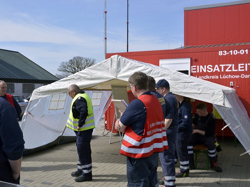 Die Kreisfeuerwehrbereitschaft aus Lüchow-Dannenberg unter Führung des stellv. Bereitschaftsführers Norbert Habermann baut ihre Befehlsstelle in dem Einsatzleitcontainer der Führungsgruppe auf dem Gelände der Ortsfeuerwehr Wustrow auf. Hier bekommen die Zugführer um 9:45 Uhr eine Einweisung in die Lage und werden mit konkreten Aufträgen in den Einsatzabschnitt entsandt: