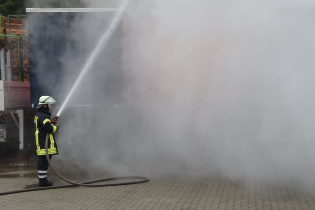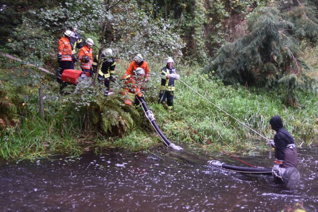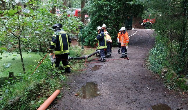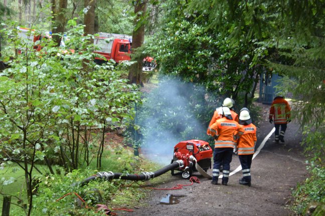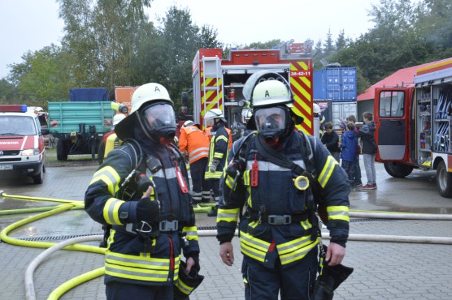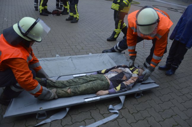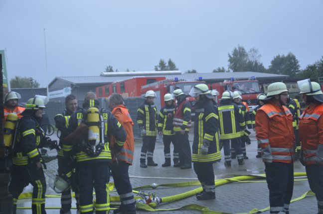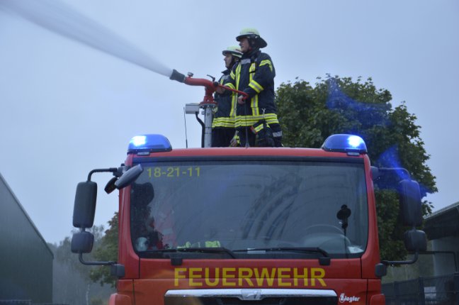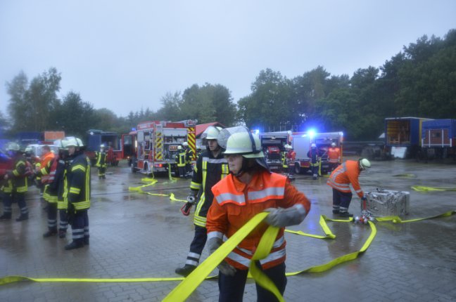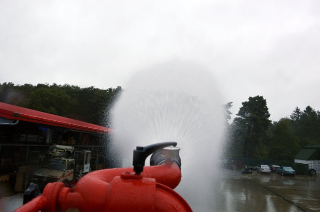 Pünktlich zum Übungsbeginn um 14 Uhr verstärkte sich der Regen erneut. Unbeeindruckt hiervon wurde auch diese Übungslage erfolgreich gemeistert. Während ein Teil der Kräfte sich um die Menschenrettung und die Brandbekämpfung kümmerte, wurde von der Schmalen Aue eine doppelte 500 Meter lange Schlauchleitung zur Löschwasserversorgung aufgebaut.