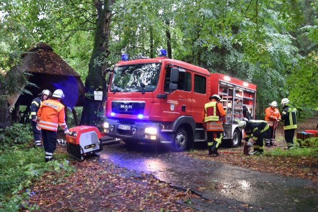 Erschwert wurde die Übung durch starken Regen, der in wahren Sturzbächen den unbefestigten Weg am Töps hinunterfloss. „Alle Aufgaben wurden trotz des schlechten Wetters gewissenhaft und zielstrebig erfüllt“, stellte Harburgs Kreisbereitschaftsführer Stephan Schick zufrieden fest.