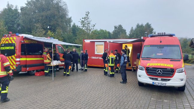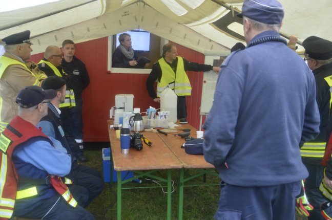 Dabei wusste auch die Führungsriege nicht, was auf sie zukommt. Die Übung wurde komplett von den Verantwortlichen der Kreisfeuerwehrbereitschaft des Landkreises Harburg ausgearbeitet, die Techn. Einsatzleitung der Gastgeber stellte dann auch die Gesamteinsatzleitung, um so auch die Kommunikation untereinander zu üben. Gegen 8:30 Uhr erfolge die Einweisung Kreisbereitschaftsführers in die Lage, die es durchaus in sich hatte: