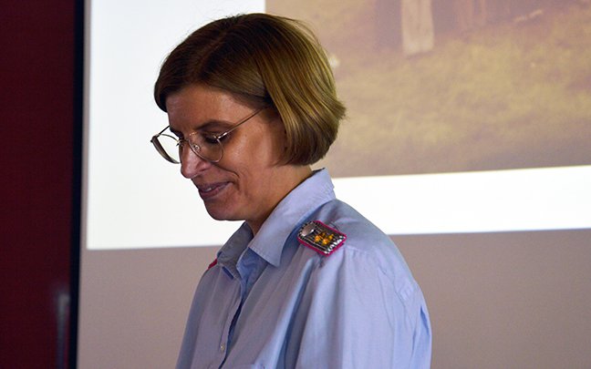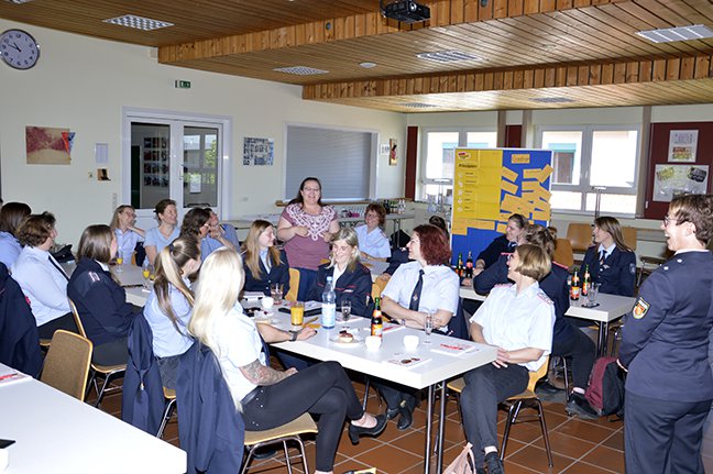 In zwei, z.T. durchaus provokanten und nicht immer ernst gemeinten Vorträgen, setzte sie immer wieder gekonnt Pointen, sodass die Veranstaltung nicht langweilig wurde. Für Kurzweile sorgte auch Franziska Schön. Die einzige Frau im Landkreis im Dienstgrad einer Hauptbrandmeisterin berichtete von ihrem Weg aus der Jugendfeuerwehr zur Verbandsführerin und in diesem Zusammenhang auch von Schwierigkeiten auf diesem Weg, die ein Mann wohl nicht gehabt hätte.
