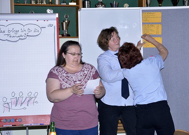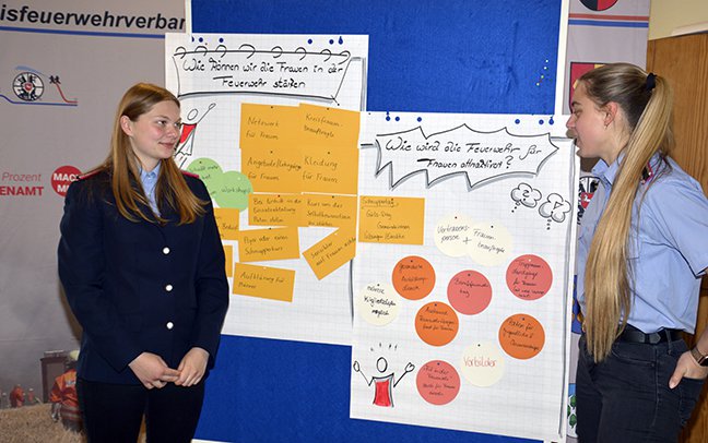 So konnten die beiden Referentinnen zahlreiche Denkanstöße geben und Impulse setzen, die nach der Mittagspause in Kleingruppen weiter vertieft wurden. Dabei standen zwei Fragen im Mittelpunkt. „Wie können wir die Frauen in der Feuerwehr stärken“ und „wie wird die Feuerwehr für Frauen attraktiver“. Die Ergebnisse hat sich Kreisbrandmeister Claus Bauck genau angeschaut und den Frauen gut zugehört. Er versicherte, dass man Seitens des Kreisfeuerwehrverbandes mögliche Maßnahmen prüfen und die Umsetzung begleiten werde.