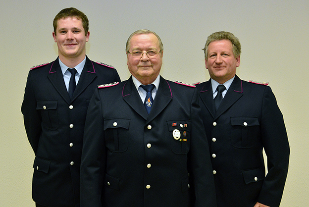 Foto (hbi): Der stellv. Ortsbrandmeister Thore Schwedland (links) und Ortsbrandmeister Stefan Schulz (rechts) verabschieden ihr „Urgestein“ Hans-Albert Thieße (mitte) in die Feuerwehrrente.