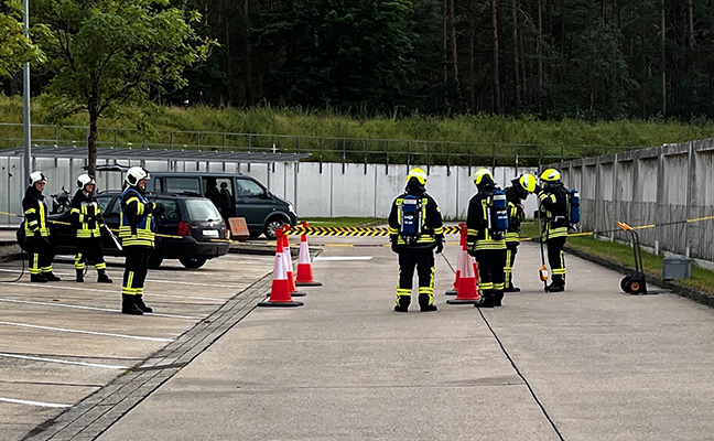 Kaum hatten die Wehren auch diese Situation im Griff, als die Übungsleitung „noch einen drauf setzte": Es habe ein Unfall mit einem Fahrzeug einer Spedition auf dem Parkplatz des Zwischenlagers gegeben, diverses Stückgut läge auf dem Asphalt, darunter auch Pakete mit einer Radioaktiv-Kennzeichnung. Dies war der Moment, an dem wiederum die Werkfeuerwehr der BGZ auf dem Waldbrand-Geschehen herausgelöst und durch erneutes Umsetzen durch andere Kräfte ersetzt werden musste. Schlussendlich hatten alle Wehren beide Lagen, Waldbrand und Autounfall, zügig abgearbeitet.