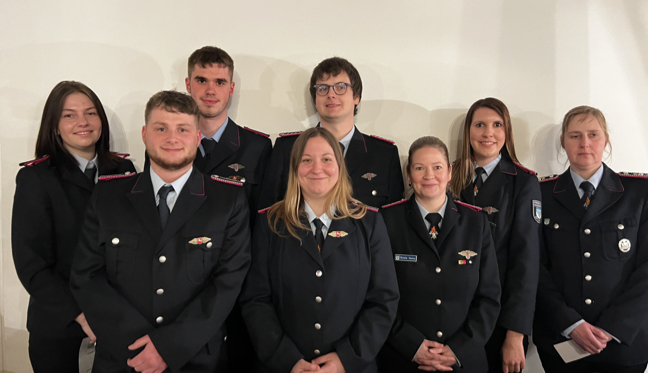 Neben der Vereidigung von zwei Feuerwehranwärtern konnten fünf Beförderungen und eine Ehrung ausgesprochen werden. Ortsbrandmeister Henry Gausmann beförderte Franziska Müller zur Feuerwehrfrau und Fabian Schmidt zum Feuerwehrmann. Natalie Konau wurde zur Hauptfeuerwehrfrau befördert. Der stellvertretende Bereichsbrandmeister Ost Thomas Schmidt beförderte Nicole Heins zur Löschmeisterin und Moritz Richter zum Löschmeister. Carmen Gausmann erhielt eine Ehrung für 25 Jahre Mitgliedschaft der Freiwilligen Feuerwehr.