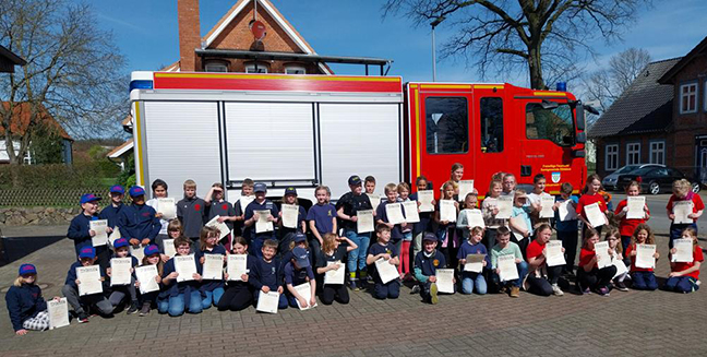 Gegen Mittag waren dann alle Kinder durch mit ihrer „ersten Prüfung“. Kreisfloriangruppenwart Timo Burmester und seine Helfer*innen verkündeten mit Stolz, dass alle bestanden haben. Erleichtert und glücklich nahmen Sie ihre Urkunde und ihr Brandfloh-Abzeichen entgegen. Der Kreisbrandmeister und sein Stellvertreter gratulierten herzlich aus der ersten Reihe.