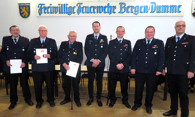 Das Ehrenzeichen des Landes Niedersachen für langjährige aktive Mitgliedschaft in der Feuerwehr wurde für 25 Jahre an Tobias Behn, für 40 Jahre an Manfred Haase und Hartmut Nolte sowie für 60 Jahre an Manfred Bühring verliehen.