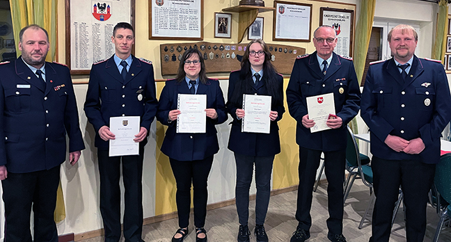 Gemeindebrandmeister Holger Friedrichs beförderte den stellvertretenden Ortsbrandmeister Malte Elsner zum Oberlöschmeister. Zudem ehrte er den Oberlöschmeister Carsten Busse für 50-jährige aktive Mitgliedschaft in der