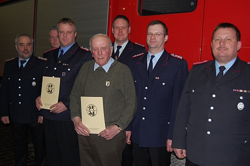 Timo Witte - zum Löschmeister befördert, Günter Grote – für 60 Jahre geehrt, Hans-Günter Grote für 25 Jahre geehrt, Mike Schneider – zum Löschmeister befördert und Ortsbrandmeister Jörg Schleese