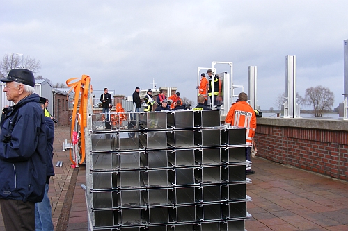 Für die rund 40 Einsatzkräfte aus den Feuerwehren Hitzacker, Penkefitz, Harlingen und Wietzeetze war es nicht das erste Mal, das sie die Stützen und Dammbalken auf der neuen Schutzmauer aus Stein und Stahlbeton aufstellen mussten. Neu ist lediglich, dass momentan das Wasser der Elbe bereits bis an die Mauer reicht und die Hochwasservorhersagenzentrale für die kommende Woche einen Rekordpegel voraussagt, welcher an die Pegelstände des Jahrhunderthochwassers im Jahre 2006 grenzen kann.