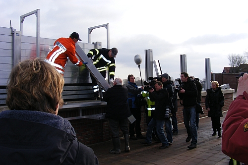 Die Feuerwehrkräfte mussten bei diesem Aufbau zunächst Stützen auf die Mauer aufschrauben und dann rund 1500 Dammbalken, die teilweise aus Stahl und Aluminium sind, zwischen diese Stützen einlassen. Besucht wurden die freiwilligen Helfer vom Niedersächsischen Umweltminister Hans-Heinrich Sander (FDP), denn Sander hatte damals nach dem Jahrhunderthochwasser mit veranlasst, dass diese Schutzmauer für die Stadt Hitzacker gebaut wurde. Begleitet von hohem Medieninteresse setzte Sander medienwirksam selbst einige Dammbalken auf die Mauer auf.