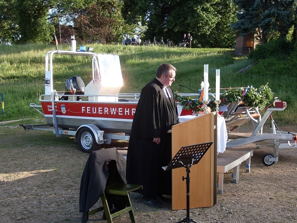 Damnatz. Mit dem Segen Gottes eilt zukünftig das neue Mehrzweckboot (MZB) der Ortsfeuerwehr Damnatz-Löschgruppe Landsatz zu Einsätzen auf dem Wasser. Im Rahmen der kürzlich stattgefundenen offiziellen Übergabe des Bootes an die Wehr , taufte Pastor Jörg Prahler im Hafen von Damnatz das neue Rettungsgerät auf den Namen „LURCH“ und gab es auch Gottes Segen mit auf seinen Weg. Besonders die Besatzung soll stets behütet und ungeschadet von Ernstfällen zurückkehren, so Prahler.