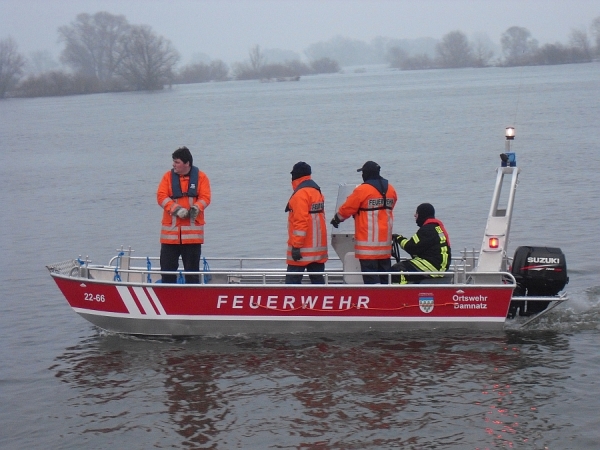 Auch eröffnet sich mit dem neuen 5,20 m langem und 2,50 breitem Mehrzweckboot ein ganz anderes Aufgabenfeld für die Feuerwehrleute. Konnten doch mit dem Vorgänger, ein Schlauchboot, lediglich kleinere Hilfeleistungseinsätze abgewickelt werden, so ist nun mit größeren und länger dauernden Einsätzen zu rechnen, so Uwe Bannöhr während seiner Worte. Möglich ist nun auch die Vornahme einer Brandbekämpfung von Bord aus, da das MZB unteranderem mit einer Tragkraftspritze beladen werden kann, die die Vornahme von mehreren Strahlrohren zu lässt. Aber auch eine Krankentrage kann im Inneren in Stellung gebracht werden, so dass gerettete Personen sicher an Land gebracht werden können. Personen und Gegenstände können zudem auch über eine Bugklappe sicher in Innere gezogen werden.