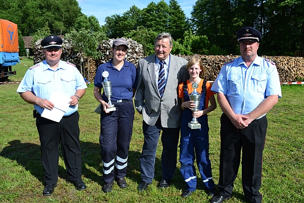 Pokale wurde an die Gruppenführerinnen der siegreichen Wehren überreicht (von links): Gemeindebrandmeister