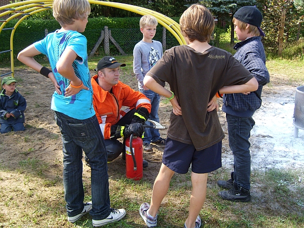 Mit einem Feuerlöscher durften die Kinder der Grundschule Gusborn einen brennenden Korb löschen