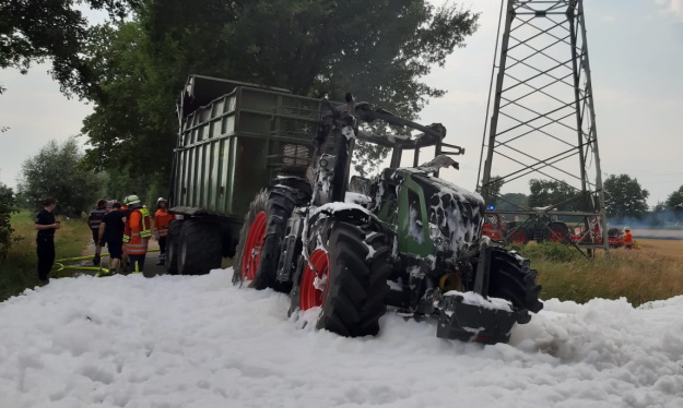 Beim Entladevorgang hatte der Anhänger die Stromleitung berührt, sodass diese riss und zu Boden fiel. Der Landwirt konnte das infolgedessen brennende Stoppelfeld noch mit seinem Gespann verlassen, bemerkte aber kurze Zeit darauf, dass auch der Traktor im hinteren Bereich bereits Feuer gefangen hatte. Die Einsatzkräfte löschten zunächst den brennenden Traktor, welcher trotz dessen nahezu komplett ausbrannte. Durch die schnelle Hilfe zweier Landwirte konnte die Ausbreitung des Brandes auf dem Stoppelfeld verhindert werden. Da die Einsatzkräfte den Bereich um die Stromleitung aus Sicherheitsgründen zunächst nicht betreten konnten, war das Umbrechen der noch nicht betroffenen Fläche durch die Landwirte die einzige Möglichkeit.