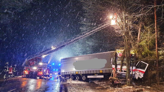 Aufgrund eines wohl zu nah entgegenkommenden LKWs führte der Kraftfahrer Lenkbewegungen zur Spurkorrektur auf der schneevermatschten Bundesstraße aus – dies führte zum Aufschaukeln des gesamten Zuges und endete mit einer Frontalkollision gegen eine ganze Eichenbaumgruppe am Straßenrand. Weitere Fahrzeuge waren zum Glück bei diesem Unfallhergang nicht betroffen und der verunglückte Kraftfahrer konnte das Fahrerhaus völlig unverletzt verlassen. Ein Wunder bei der Stärke des Aufpralls.