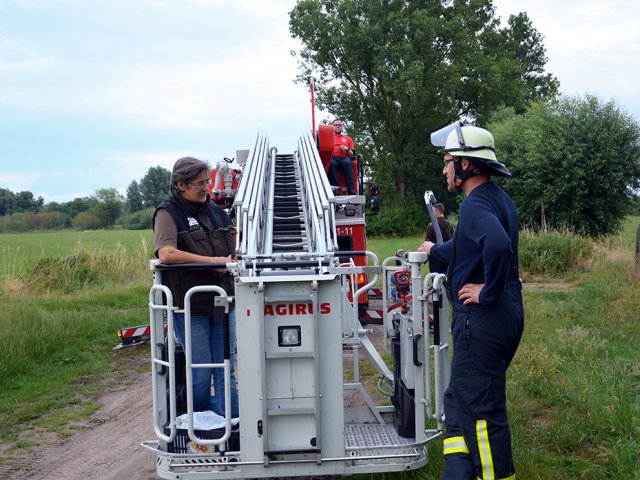 Bei unserer Ankunft saß ein Elternteil schon am Horst und wartete auf den Nachwuchs – ein fast schon trauriges Bild, doch wir wussten ja, dass gleich alles gut wird. Fliegen kann Hein noch nicht, also nahmen wir die Drehleiter zu Hilfe und brachten Hein in sein 11m hohes „Wohnzimmer“. Zum Abschied ließ Antje ihm noch ein bisschen Futter im Horst zurück, was sich wenig später als völlig überflüssig darstellen sollte. Unser Herz blutete schon ein wenig, als wir mit der Drehleiter zurück und ohne Hein nach unten fuhren.