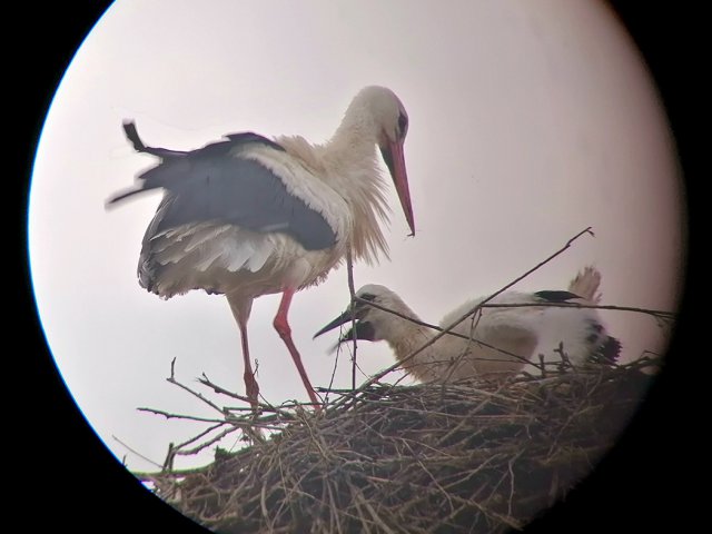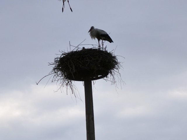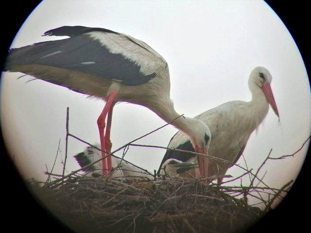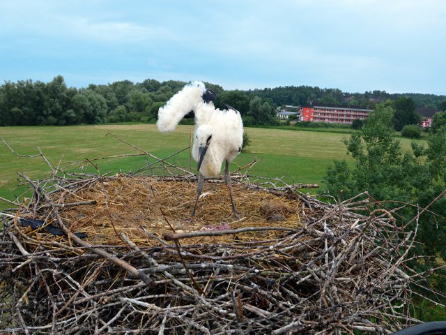 Was dann passierte war wirklich ein toller Anblick – nachdem die Drehleiter unter dem Horst weggefahren war, konnten wir beide Elterntiere beobachten, wie sie sich vorsichtig näherten. Erst schaute ein Altstorch nach dem rechten und hatte auch gleich einen kapitalen Regenwurm für Hein im Schnabel, dann kam auch der zweite Vogel dazu – nach nicht einmal 1 Stunde war das Familienglück perfekt, die Eltern hatten ihren Hein wieder und unser Job war getan.
