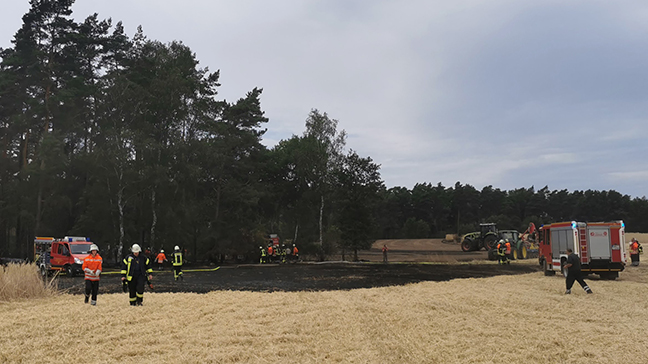 Sallahn/Ldkrs. Lüchow-Dannenberg (hbi) Am frühen Freitagnachmittag gab es Alarm für zahlreiche Feuerwehren in Lüchow-Dannenberg. Südwestlich der Ortschaft Sallahn wurde ein Waldbrand gemeldet. Um 14:05 wurden die ersten Einsatzkräfte zur Einsatzstelle entsandt, vor Ort bestätigte sich die Lage: aus bislang ungeklärter Ursache geriet ein Stoppelfeld in Brand, schnell griff das Feuer auf den angrenzenden Nadelwald über. Das Feuer sprang zudem über einen Weg und breitete sich auf ein weiteres Getreidefeld aus.