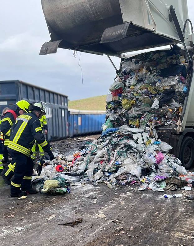 Vor Ort wurde entschieden, das Fahrzeug unter Begleitung der Feuerwehr nach Woltersdorf zu überführen, um das KFZ dort kontrolliert zu entleeren und den Inhalt abzulöschen. Und so eskortierten zwei Feuerwehrfahrzeuge und insgesamt 14 Einsatzkräfte das Müllfahrzeug zur Deponie, wo die Feuerwehrkameradinnen und Kameraden sich über den Inhalt nur wundern konnten: