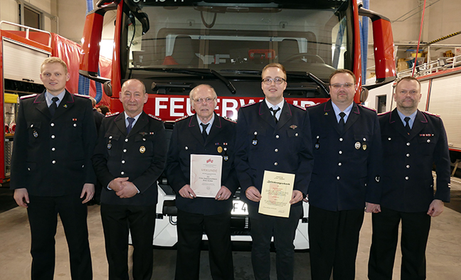 Bereichsbrandmeister Mitte Tobias Hundt beförderte den stellvertretenden Gruppenführer Rene Schmidt zum Löschmeister. Zudem gab es besondere Ehrungen: Hubert Pagel erhielt das Niedersächsische Feuerwehr-Ehrenabzeichen für 50 Jahre aktive Mitgliedschaft, während Ehrenmitglied Ernst Krone für 60 Jahre Mitgliedschaft ausgezeichnet wurde.