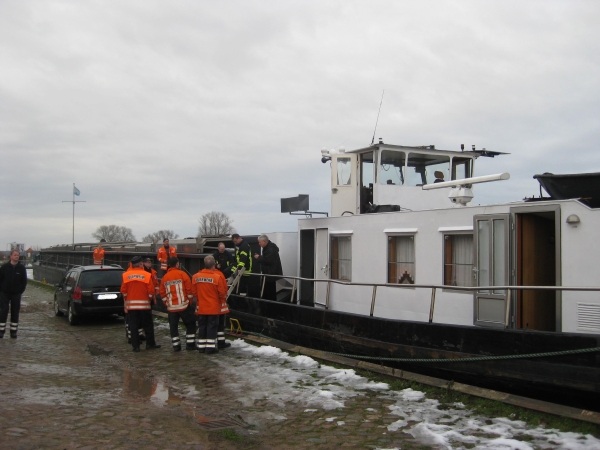Um Antworten auf diese Fragen zu finden hat die Wasserrettung der Kreisfeuerwehr einen Sonderdienst für die Bootswehren arrangiert. Am Samstag, dem 8. Januar ging die Fahrt nach Bleckede in den dortigen Hafen. Hier liegt seit gut 3 Wochen das Motorgüterschiff „Diamant II“ auf Grund des Eisganges der Elbe fest vertäut im Hafen. Der Eigner des Schiffes zeigte mit Elan die im Einsatz relevanten Wichtigkeiten, erklärte alle technischen Details und war für jede Nachfrage offen. Immer mit dem Hintergedanken, dass auch auf seinem Schiff mal etwas passieren kann.